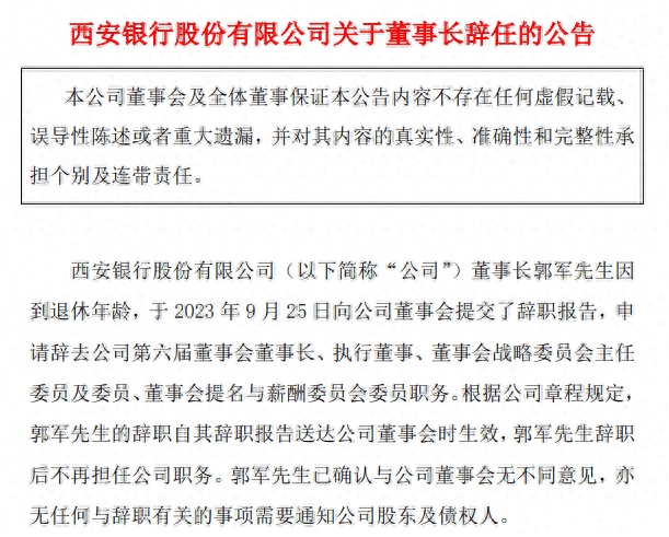 9月25日,西安银行公告称,该行董事长郭军、监事长李富国因到退休年龄辞任,暂由行长梁邦海代为履行董事长职务。