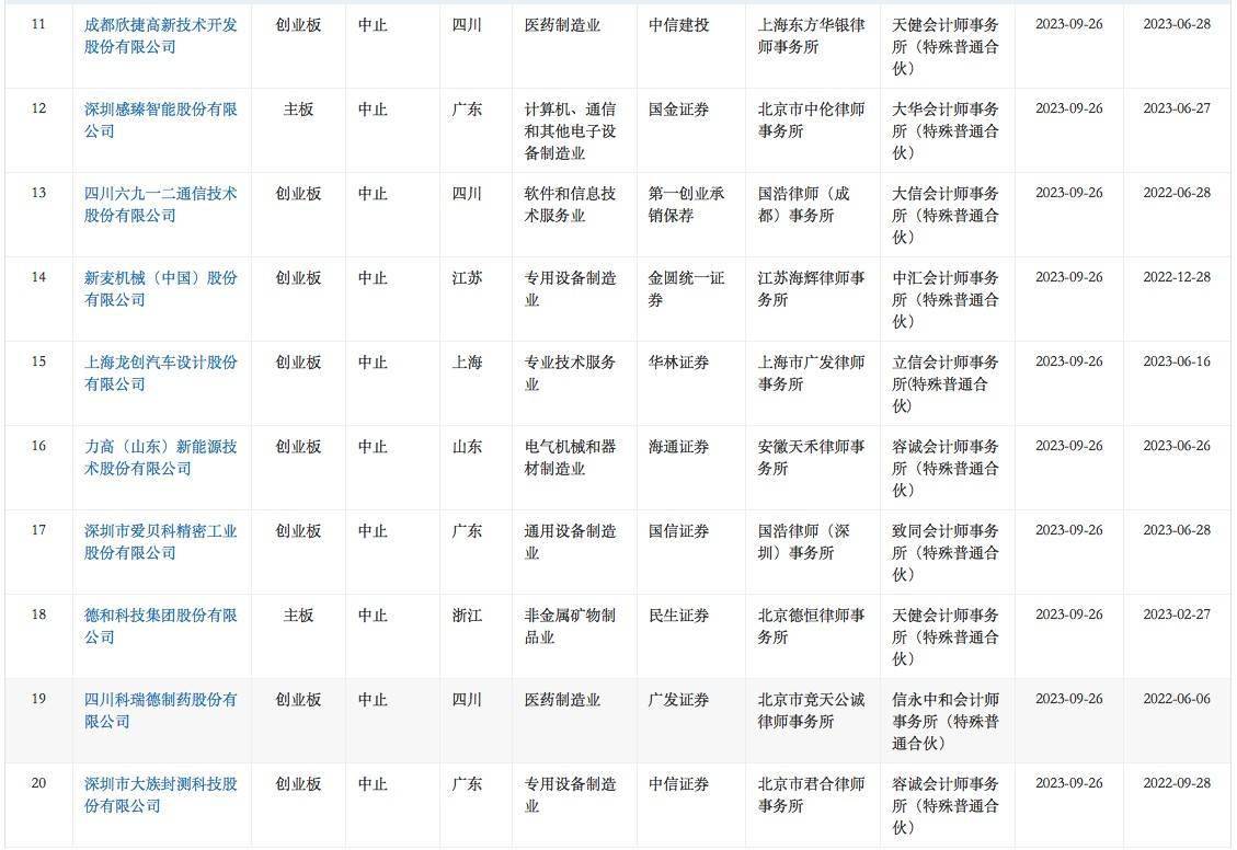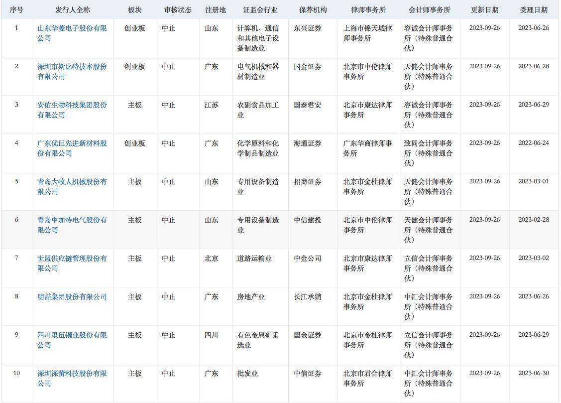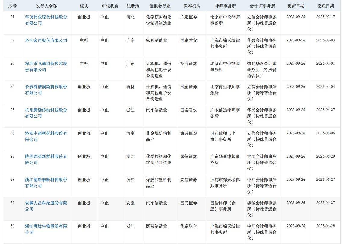 智通财经APP获悉,9月26日,华菱电子、斯比特、安佑生物、优巨新材、中加特、大牧人、世盟股份、明喆集团、里伍铜业、深蕾科技、欣捷高新、感臻智能、六九一二、新麦机械、龙创设计、力高新能、爱贝科、德和科技、科瑞德、大族封测、华茂伟业、科凡家居、飞速创新、海谱润斯、腾励传动、中超股份、陕西瑞科、德斯泰、大昌科技、湃肽生物、百图股份、威达智共32家企业申请深交所IPO审核状态变更为“中止”。