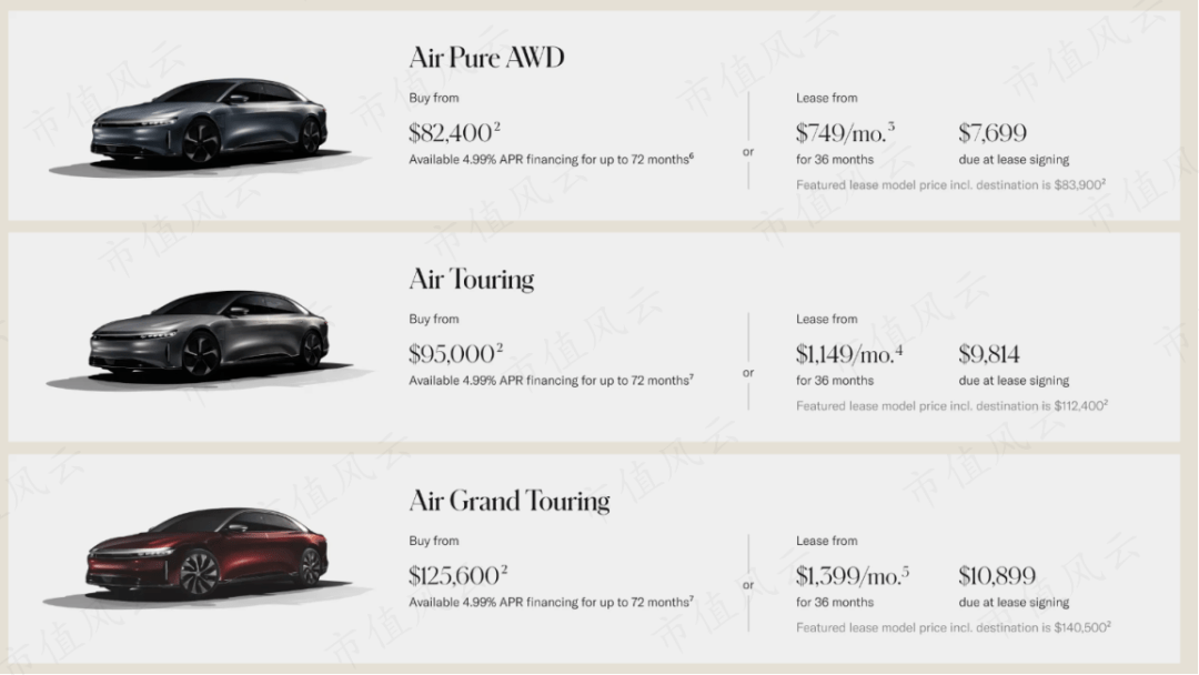 由于Lucid定位高端豪华车型,目前在售车型从8.24万的基本款的四驱Air Pure(更便宜的后驱款目前并不在售)到12.56万的Air Grand Touring不等,因此和特斯拉的Model S,保时捷Taycan,奔驰EQS等产品直接竞争。