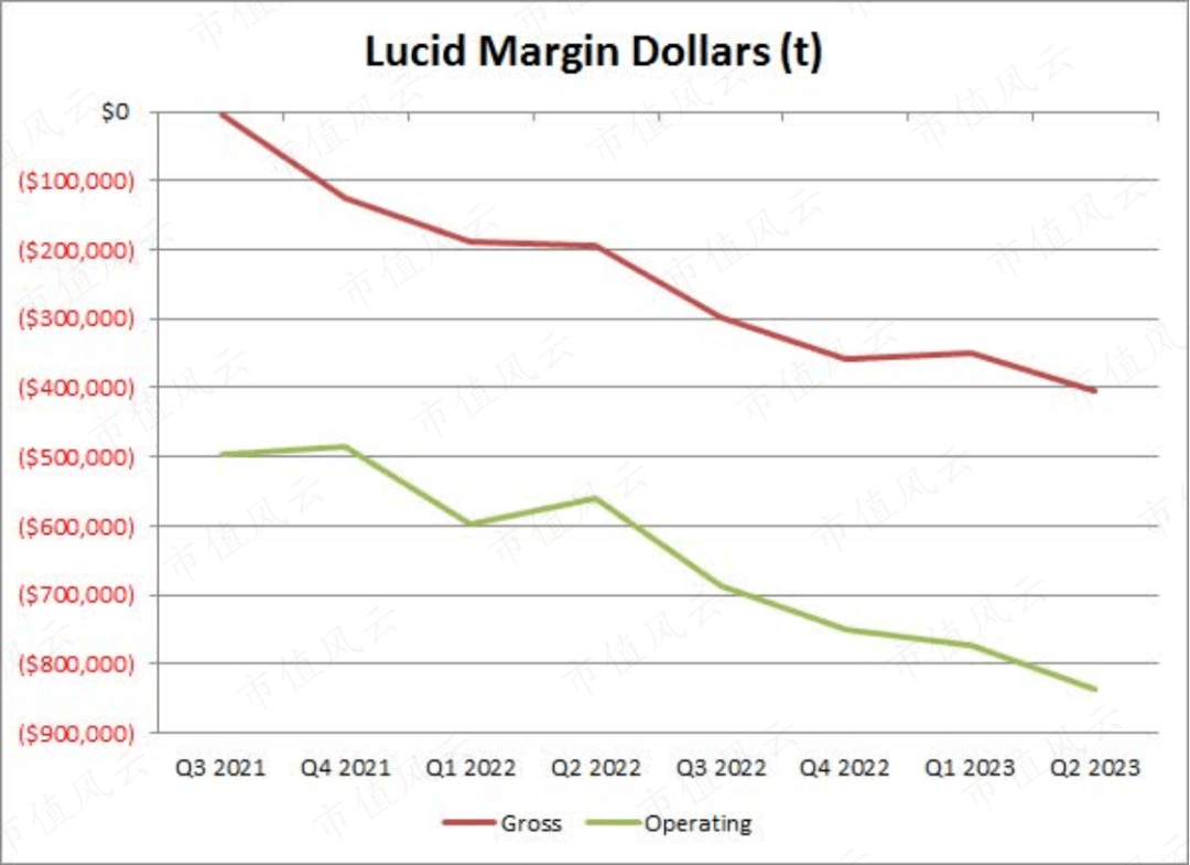 从第一辆Lucid Air开出卡萨格兰德工厂那天算起,截至2023年H1,由汽车销售带来的累计毛亏损已达4亿,累计营业亏损为8.38亿。