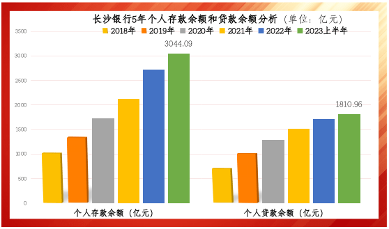 2023上半年,长沙银行的零售业务结出丰硕成果,零售存款、利润的占比接近半数。截至2023年6月末,该行个人存款余额达到3044.09亿元,较2018年末的1028.48亿元,累计增长195.98%;个人贷款余额达到1810.96亿元,较2018年末的712.10亿元,累计增长154.31%。