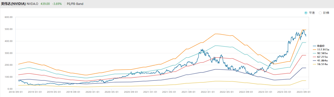 但是和英伟达的区别在于,苹果的PE一直不算高,大多在30倍以下,市场对其预期稳定。而英伟达是在高预期的背景下,PETTM超过100倍,即使用2024年业绩预期估值也有50倍PE。