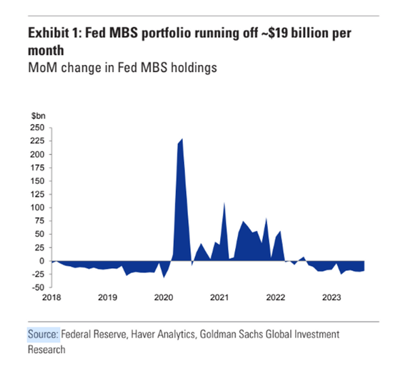 以Roger Ashworth为首的高盛信贷分析师在一份每周客户报告中写道,“在‘利率在更长时间内维持高位’的背景下,我们将重点转向美联储的MBS投资组合,目前该投资组合的每月减持约190亿美元”。