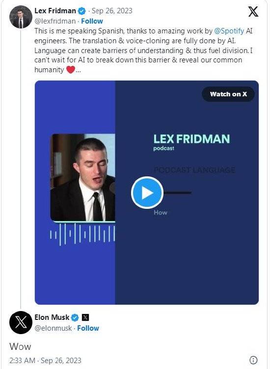 知名播客主持人和计算机科学家莱克斯·弗里德曼在X平台上发帖,表达了他对Spotify的人工智能翻译和语音克隆能力的兴奋之情。