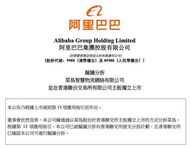 回顾菜鸟上市历程,9月26日晚间阿里巴巴在港交所公告,拟通过以菜鸟股份于香港联交所主板独立上市的方式分拆菜鸟。