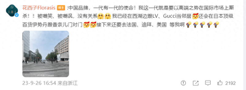 其中一条写道:“中国品牌,一代有一代的使命!我这一代就是要以高端之势在国际市场上厮杀!!被嘲笑、被嘲讽,没有关系。我已经在西湖边跟LV、Gucci当邻居,还会在日本顶级百货伊势丹跟香奈儿门对门,接下来还要去法国、迪拜、美国,等我啊”。