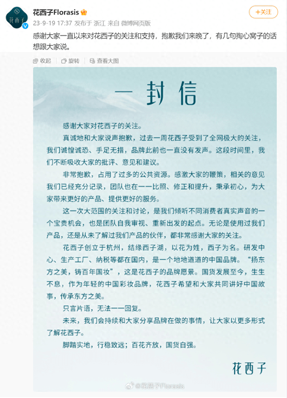 事件发生9天后,9月19日下午,花西子首度对该事件作出回应,在官方微博账号发布了一封道歉信,并在微博发起了有奖征集,计划送出100份美妆礼盒和10000支眉笔。