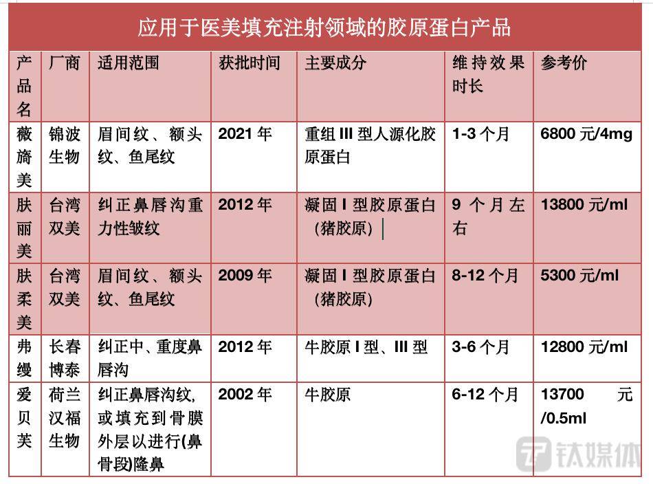 钛媒体 APP 了解到,胶原蛋白产品在医美注射填充方面的应用主要集中于 " 眼周抗衰 ",该领域的胶原蛋白产品主要包括薇旖美、台湾双美的肤丽美(凝固 I 型胶原蛋白)、长春博泰的弗曼(牛胶原 I 型、III 型)等。目前获批的可用于注射填充领域的胶原蛋白产品不多,整体而言,该领域主要还是以玻尿酸为主,胶原蛋白渗透率相对较低。