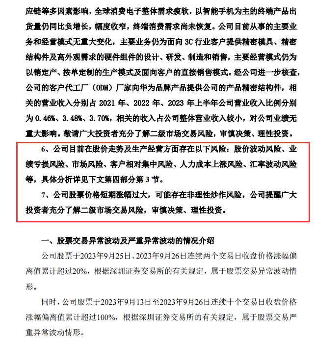 捷荣技术发布股票交易异常波动及严重异常波动公告,公司目前在股价走势及生产经营方面存在以下风险:股价波动风险、业绩亏损风险、市场风险、客户相对集中风险、人力成本上涨风险、汇率波动风险等。公司股票价格短期涨幅过大,可能存在非理性炒作风险,公司提醒广大投资者充分了解二级市场交易风险,审慎决策、理性投资。