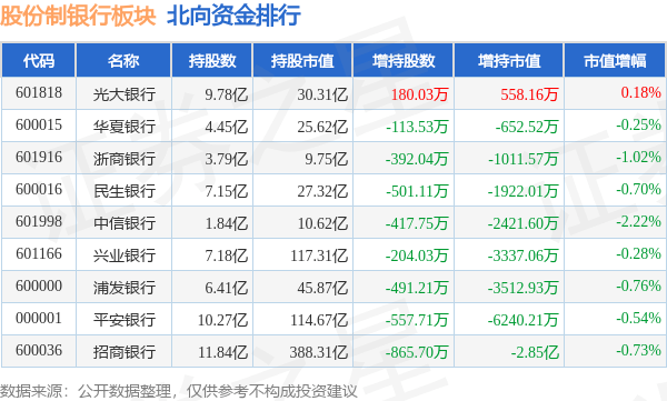 北向资金方面,当日股份制银行板块北向资金持股市值为769.79亿元,减持4.7亿元。其中增持最多的是光大银行,增持了558.16万元。减持持最多的是招商银行,减持了2.85亿元。股份制银行板块北向资金持股变动明细见下表: