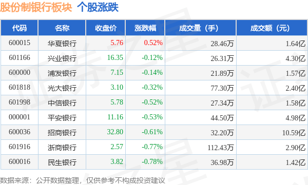 9月26日股份制银行板块较上一交易日下跌0.42%,民生银行领跌。当日上证指数报收于3102.27,下跌0.43%。深证成指报收于10060.15,下跌0.6%。股份制银行板块个股涨跌见下表: