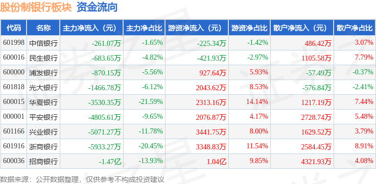 从资金流向上来看,当日股份制银行板块主力资金净流出3.74亿元,游资资金净流入2.39亿元,散户资金净流入1.34亿元。股份制银行板块个股资金流向见下表: