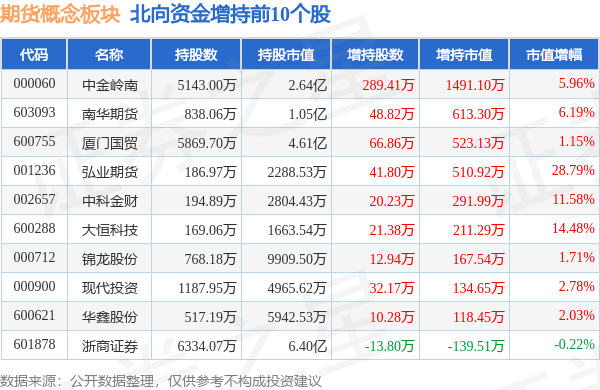 北向资金方面,当日期货概念板块北向资金持股市值为49.6亿元,减持0.2亿元。其中增持最多的是中金岭南,增持了0.15亿元。减持持最多的是中粮资本,减持了0.13亿元。期货概念板块北向资金持股变动明细见下表: