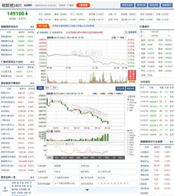 9月26日,碳酸锂期货主力2401合约跌5.87%,至149100元/吨。