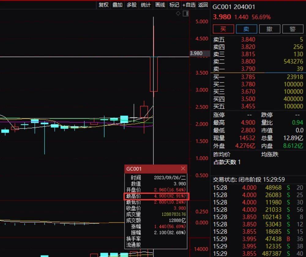行情数据显示,沪市1天期国债逆回购(GC001)年化收益率盘中最高较上一交易日飙升92.91%,年化收益率一度达到4.900%,为近期该品种常态化利率水平的2倍有余。