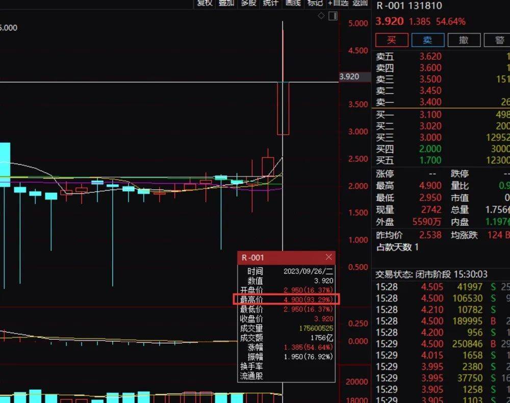 深市1天期国债逆回购(R-001)年化收益率走势也大体相似,盘中最高较上一交易日飙升93.29%,报4.900%,亦为近期该品种常态化利率水平的2倍有余。