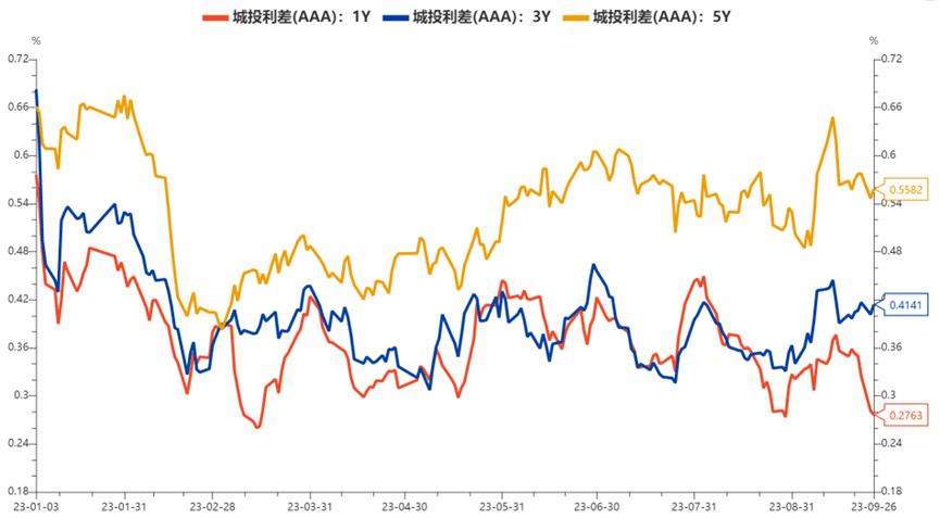 5、近期城投债(AAA)各期限利差走势及数据