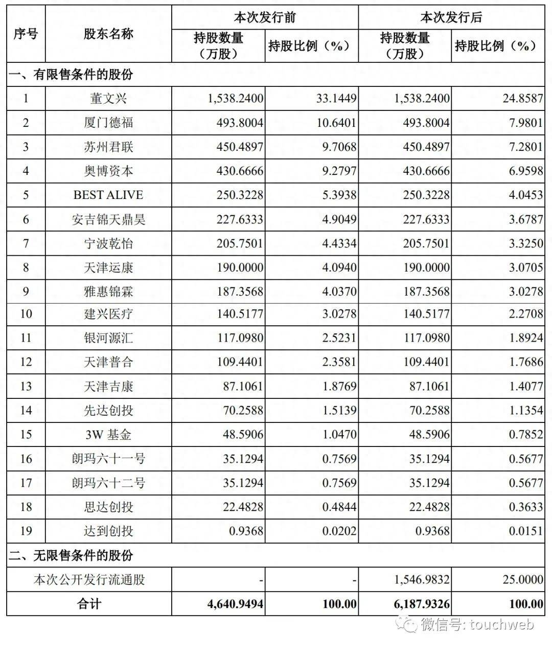 IPO后,董文兴直接持股为24.8587%,厦门德福持股为7.9801%,苏州君联持股为7.2801%,奥博资本持股为6.9598%,BEST ALIVE持股为4.0453%,安吉锦天鼎昊持股为3.6787%,宁波乾怡持股为3.325%,天津运康持股为3.0705%,雅惠锦霖持股为3.0278%。