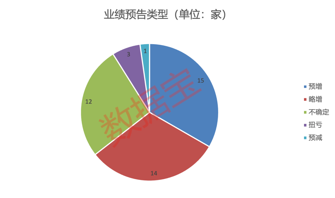从预告类型来看,预增、略增、扭亏等业绩预喜的公司合计达32家,占比超七成;预减的公司有1家,预告类型为不确定的有12家。
