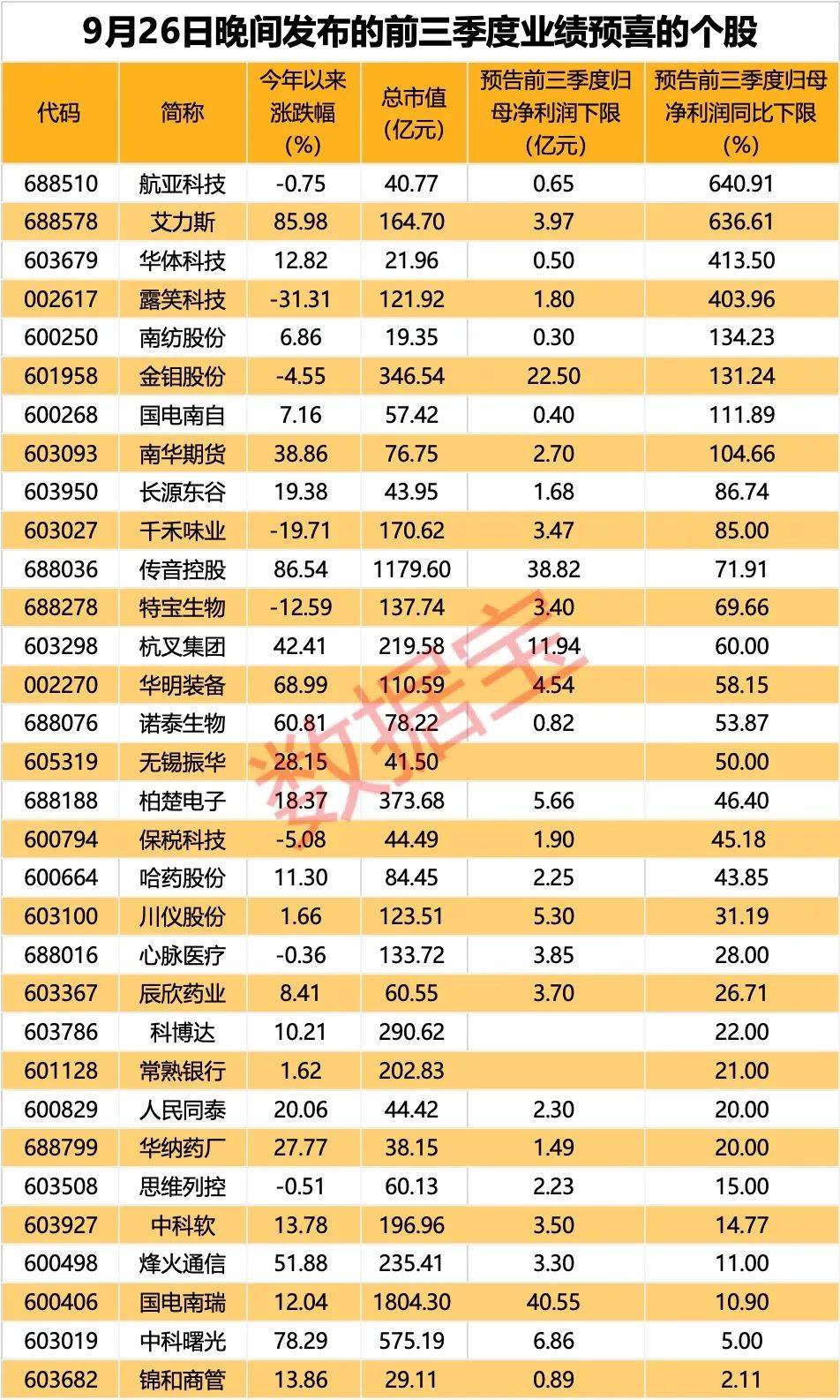 以预计净利润增幅下限统计,业绩预喜股中,航亚科技、艾力斯、华体科技、露笑科技、金钼股份、国电南自等8家公司业绩增长幅度居前,净利润同比增幅均超100%。
