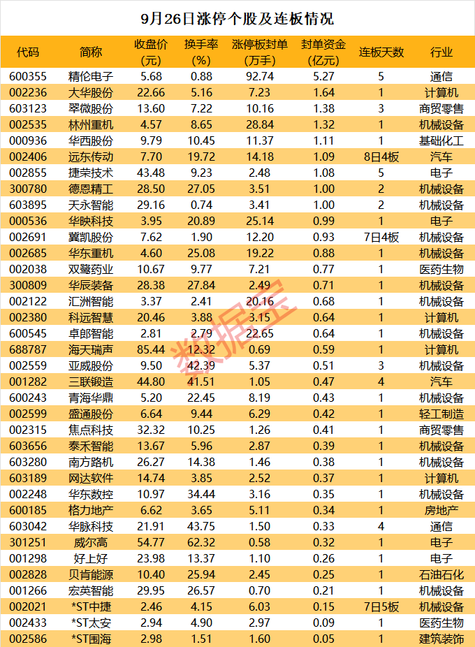 涨停个股:精伦电子、林州重机、远东传动、威尔高、德恩精工、天永智能、冀凯股份、华东重机、华辰装备、汇洲智能、科远智慧、卓郎智能、亚威股份、三联锻造、青海华鼎、泰禾智能、南方路机、华东数控、宏英智能