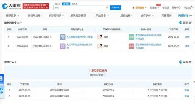 据风险信息显示,此前郑爽及两工作室已因上述案件被强制执行约1.28亿元。