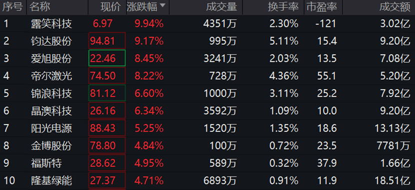 关联指数中证光伏产业指数(931151)成份股中,露笑科技涨停,钧达股份上涨9.17%,爱旭股份上涨8.45%,帝尔激光、锦浪科技等个股跟涨。