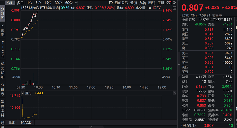 ETF方面,截至2023年9月27日9:59,光伏ETF指数基金(159618)早盘拉升,大涨3.20%,成交额持续扩大,市场交投活跃。