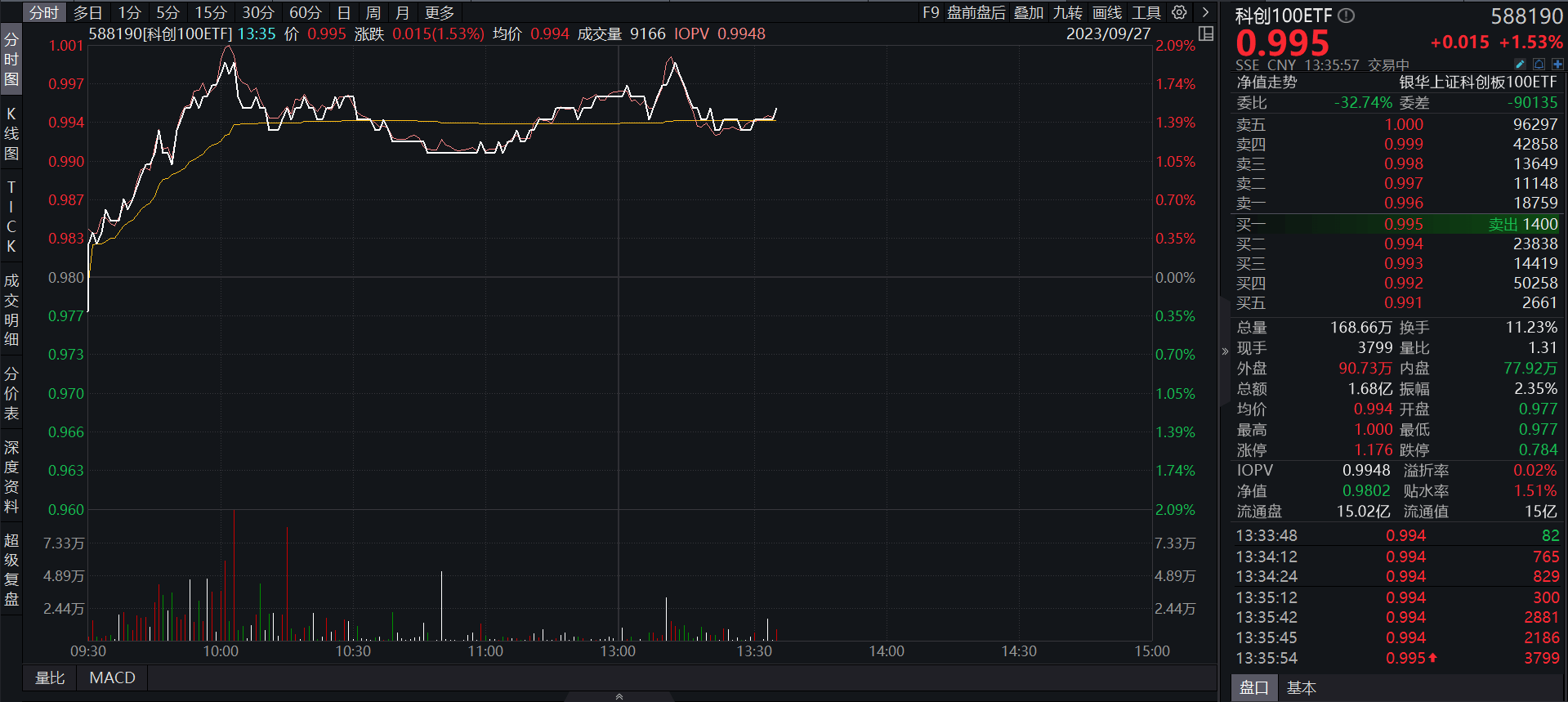 截至2023年9月27日13:35,科创100ETF(588190)震荡走强,现涨1.53%,成交额达1.68亿元,换手率达11.23%,市场交投活跃,资金布局意愿强烈。