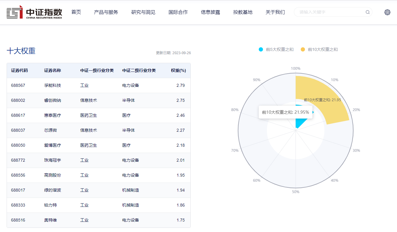 数据显示,截至2023年9月26日,该指数前十大权重股包括孚能科技、睿创微纳、惠泰医疗、芯源微、爱博医疗等,前十大之和为21.95%。(数据来源:中证指数公司,指数成份股不代表个股推荐)