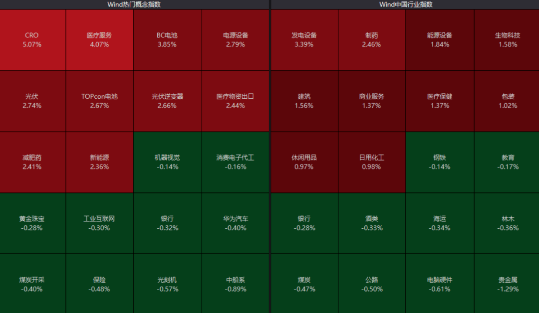 板块方面, 新能源、医药权重全线发力,医药板块强势反弹,CRO板块持续发力;光伏股集体走强,电源设备、TOPCon电池等新能源赛道纷纷拉升。而银行板块早盘跳水,煤炭、贵金属、光刻机等板块跌幅居前。