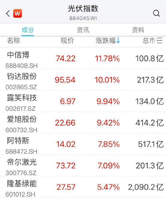 光伏概念股集体走强,钧达科技、露笑科技涨停,爱旭股份、隆基绿能、锦浪科技涨超5%,通威股份、阳光电源、晶澳科技等权重股同样走高。