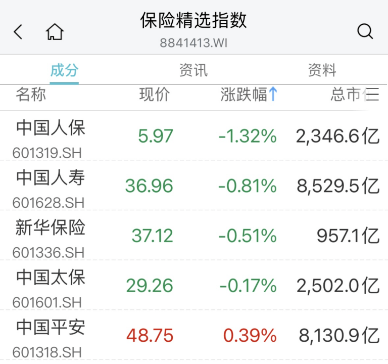 保险股同样走低,中国人保跌超1%,中国人寿、新华保险、中国太保跟跌,仅中国平安实现小幅上涨。