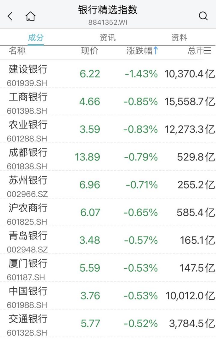 大金融板块走低,银行股盘中跳水,建设银行、工商银行、农业银行等纷纷下跌。
