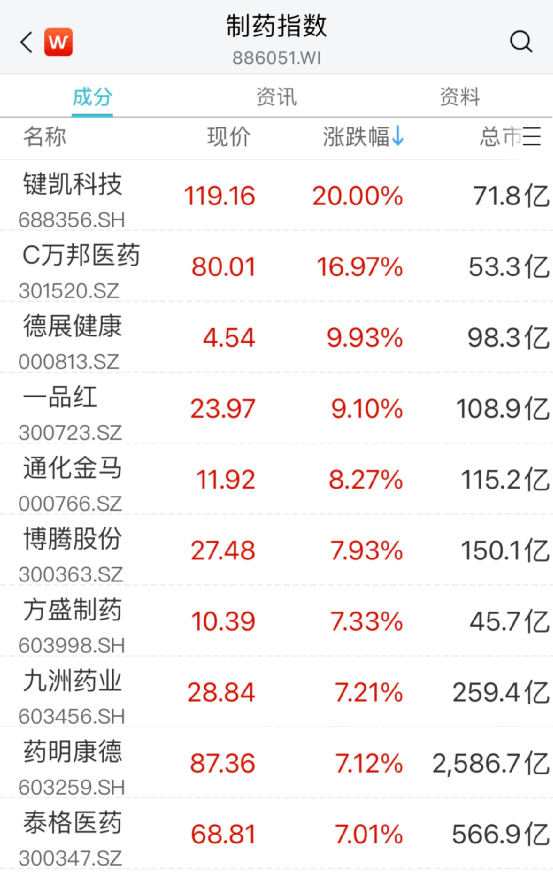 制药板块再度大涨,键凯科技20CM涨停,德展健康涨停,一品红、通化金马等跟涨。此外,减肥药继续保持活跃,纳微科技、诺泰生物、博瑞医药等涨幅居前。