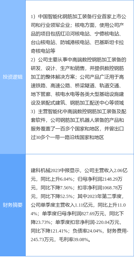 建科机械涨停收盘,收盘价25.81元。该股于9点35分涨停,3次打开涨停,截止收盘封单资金为3381.11万元,占其流通市值2.39%。