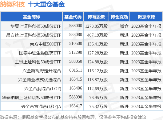 根据2023基金半年报公募基金重仓股数据,重仓该股的公募基金共136家,其中持有数量最多的公募基金为华夏上证科创板50成份ETF。华夏上证科创板50成份ETF目前规模为671.92亿元,最新净值0.9194(9月26日),较上一交易日上涨0.12%,近一年下跌8.54%。该公募基金现任基金经理为张弘弢 荣膺。张弘弢在任的基金产品包括:华夏沪深300ETF联接A,管理时间为2009年7月10日至今,期间收益率为33.75%;华夏沪深300ETF,管理时间为2012年12月25日至今,期间收益率为88.63%;华夏网购精选混合A,管理时间为2016年11月2日至今,期间收益率为27.5%;华夏上证50ETF,管理时间为2016年11月18日至今,期间收益率为23.63%。荣膺在任的基金产品包括:华夏中证500ETF联接A,管理时间为2016年10月20日至今,期间收益率为-2.41%;华夏中证500ETF,管理时间为2016年10月20日至今,期间收益率为-2.41%;华夏中证央企ETF,管理时间为2018年10月19日至今,期间收益率为27.53%;华夏创业板价值ETF,管理时间为2019年6月14日至今,期间收益率为34.96%。