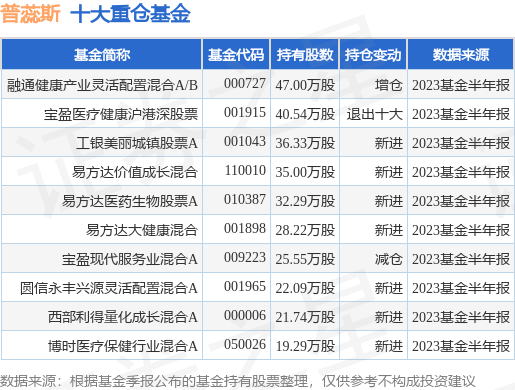 根据2023基金半年报公募基金重仓股数据,重仓该股的公募基金共94家,其中持有数量最多的公募基金为融通健康产业灵活配置混合A/B。融通健康产业灵活配置混合A/B目前规模为38.07亿元,最新净值2.953(9月26日),较上一交易日下跌0.54%,近一年上涨13.8%。该公募基金现任基金经理为万民远。万民远在任的基金产品包括:融通鑫新成长混合A,管理时间为2021年10月8日至今,期间收益率为18.57%;融通价值成长混合A,管理时间为2022年7月18日至今,期间收益率为3.11%;融通医疗保健行业混合A/B,管理时间为2023年3月15日至今,期间收益率为-13.49%。