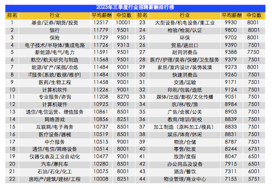 行业方面,三季度金融行业仍高薪。其中,基金/证券/期货/投资行业平均招聘薪酬仍最高,达到12517元,薪酬中位数也过万;银行的薪资水平排名升至第二位,达到11779元,薪酬中位数在9500元左右;保险行业较上季度增长4.1%,达到11729元,排名第三。