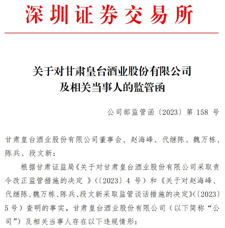 监管函指出,皇台酒业董事长赵海峰、董事兼总经理代继陈、时任财务总监魏万栋、副总经理陈兵、时任董事会秘书段文新对上述违规行为负有主要责任。