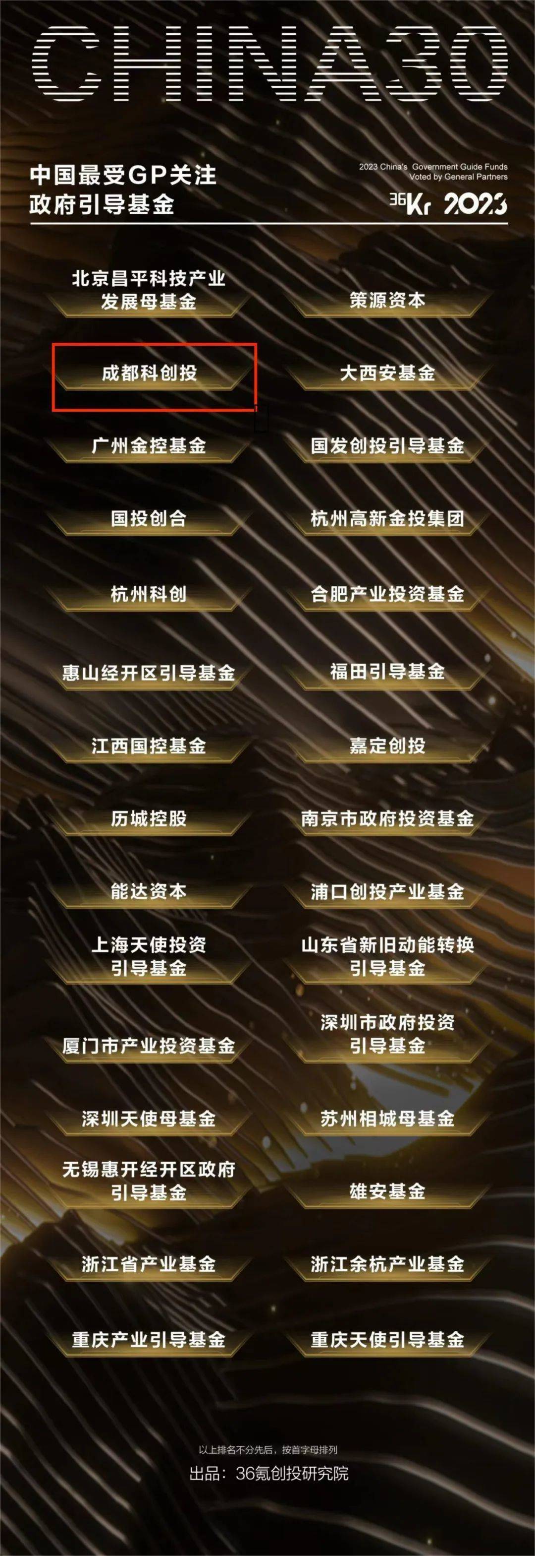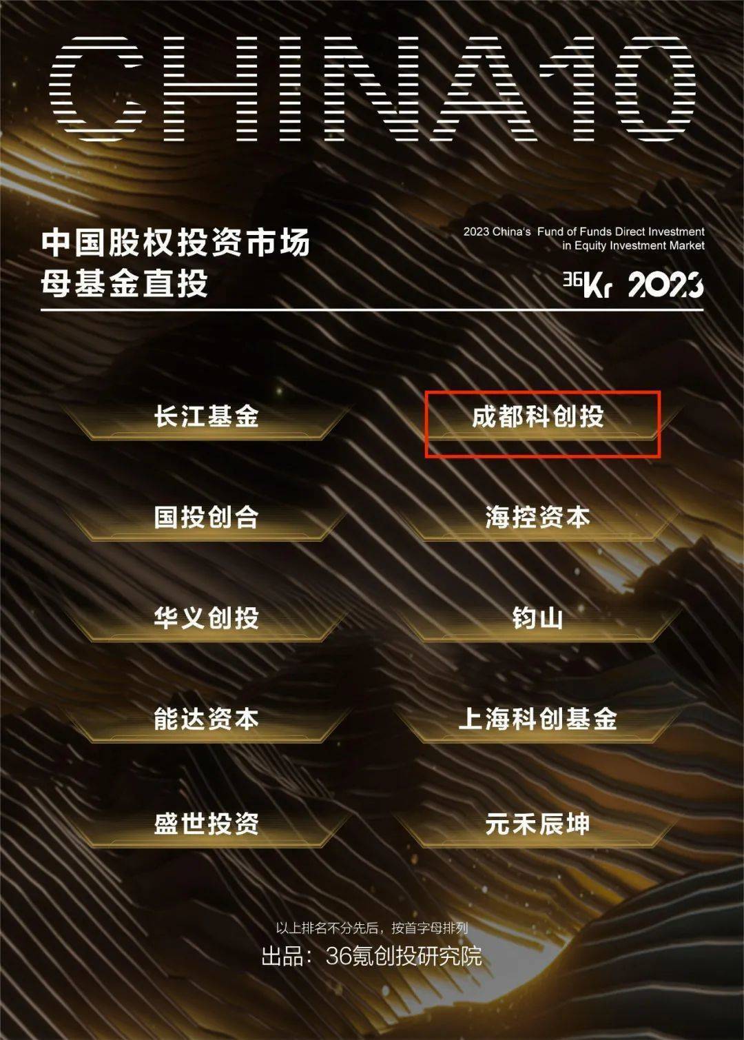 2023年9月22日,36氪发布2023年度中国股权投资机构调研结果,成都产业集团下属成都科创投荣登“中国股权投资市场母基金直投TOP10”“中国最受GP关注市场化母基金TOP30”“ 中国最受GP关注政府引导基金TOP30”榜单 。