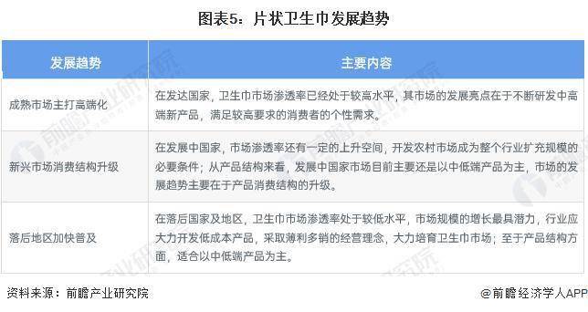 未来,全球卫生巾市场主要的发展趋势包括发达国家等成熟市场主打高端化、发展中国家产品消费结构升级、落后国家及地区加快普及。