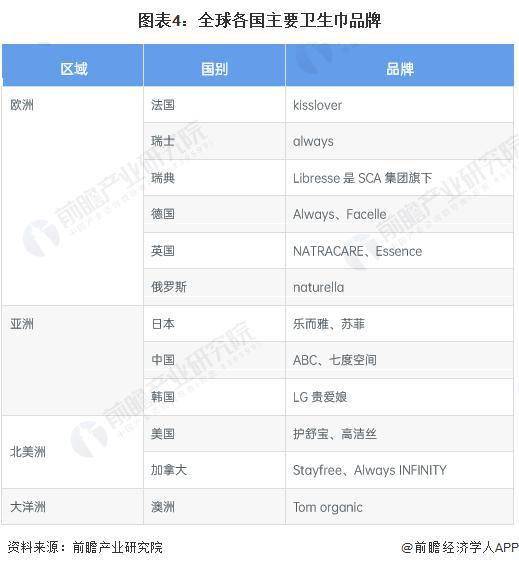 全球卫生巾市场上,宝洁、花王、强生、尤妮佳、金佰利5 家跨国公司占据了较大的市场份额,产品主打中高端市场。目前全球卫生巾品牌中,除了上文中提到的五家全球性跨国公司,各个国家也都有自己的知名品牌: