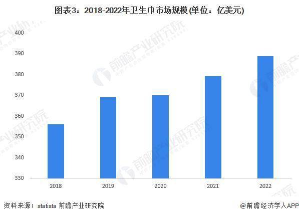 根据 Statista 统计数据,2018-2020 年全球女性卫生用品零售规模呈波动增长趋势。2020 年,全球女性卫生巾行业市场规模为 370 亿美元,2022 年全球女性卫生巾市场规模初步统计为 389 亿美元。