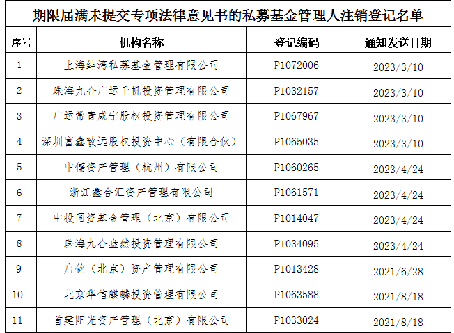 现有上海绅湾私募基金管理有限公司等11家私募基金管理人存在异常经营情形,且未能在书面通知发出后的3个月内提交符合规定的专项法律意见书,协会将注销该11家机构的私募基金管理人登记,并将上述情形录入证券期货市场诚信档案数据库。已注销的私募基金管理人和相关当事人,应当根据法律法规、证监会规定以及协会相关自律规则、基金合同约定,妥善处置在管基金财产,依法保障投资者的合法利益。