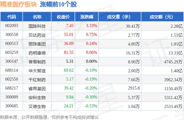 9月26日精准医疗板块较上一交易日下跌0.35%,仁度生物领跌。当日上证指数报收于3102.27,下跌0.43%。深证成指报收于10060.15,下跌0.6%。精准医疗板块个股涨跌见下表: