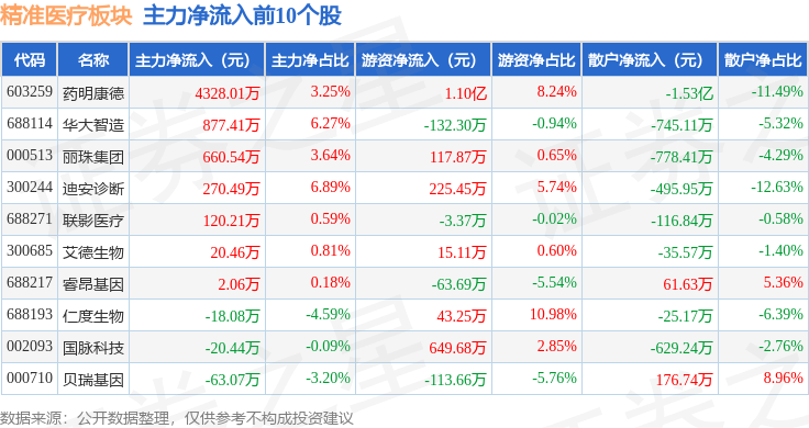 从资金流向上来看,当日精准医疗板块主力资金净流出1120.89万元,游资资金净流入8680.73万元,散户资金净流出7559.84万元。精准医疗板块个股资金流向见下表: