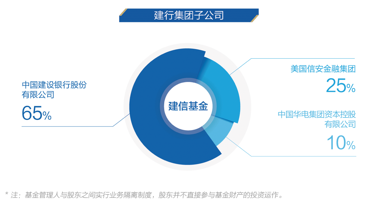 官网资料显示,建信基金成立于2005年9月,是境内首批成立的银行系基金公司之一,注册资本为2亿元。建信基金现有三大股东,其中建设银行为第一大股东,持股比例为65.0%;美国信安金融集团为第二大股东,持股比例为25%;中国华电集团资本控股有限公司则持股10%。