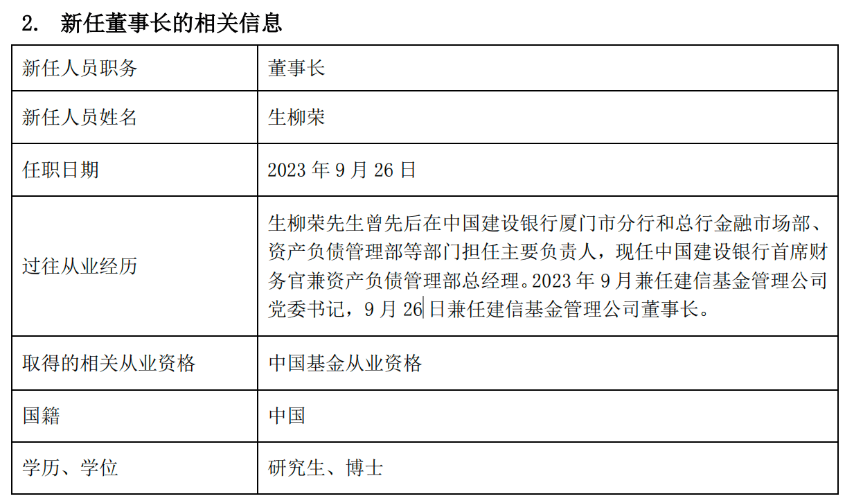 9月28日晚间,建信基金发布董事长任职公告,生柳荣正式任职建信基金党委书记、董事长,任职日期为9月26日,张军红不再代为履行董事长职务。