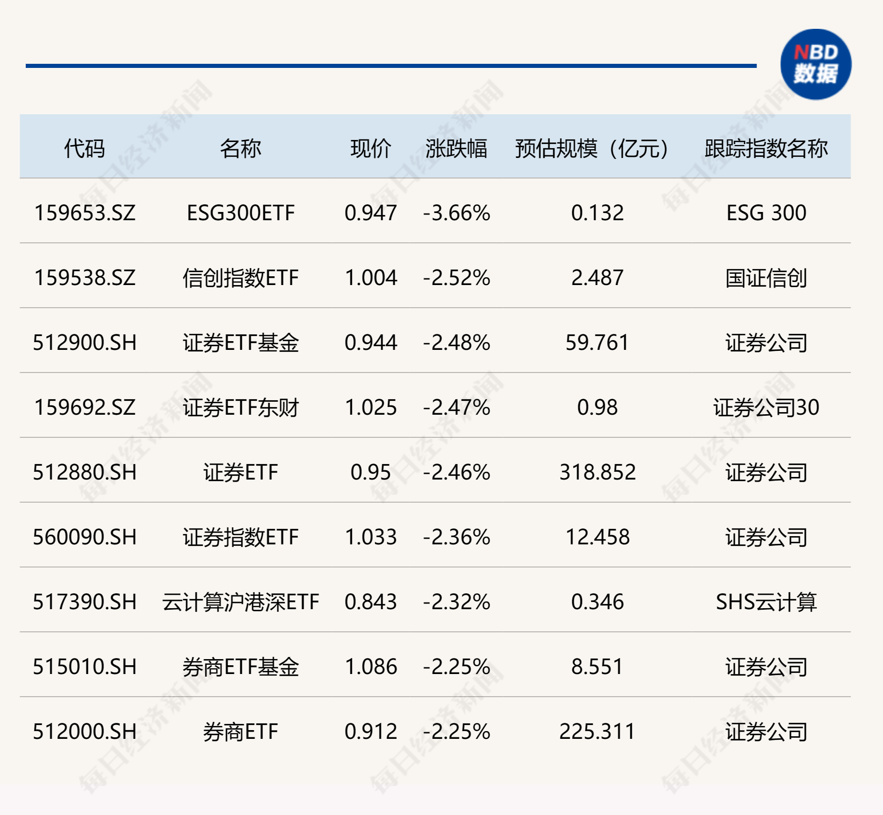 ESG300ETF和信创指数ETF分别跌3.66%和2.52%。